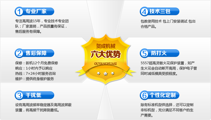 賀成機(jī)械專業(yè)生產(chǎn)高周波設(shè)備、精制高周波模具、供應(yīng)高周波配件和耗材、提供高周波維修、高周波加工及高周波出租服務(wù)。專注高周波15年,為廣大高周波用戶提供一站式采購、服務(wù)平臺。